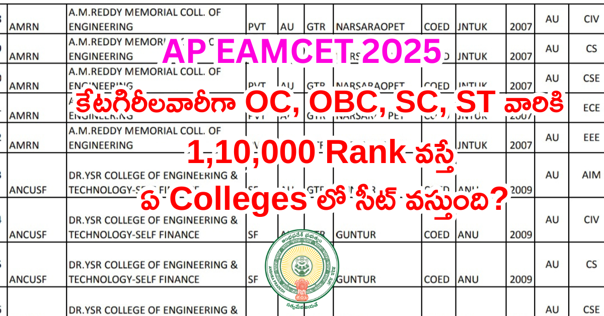 AP EAMCET 2025: Rank 1,10,000 వస్తే, కేటగిరీలవారీగా OC, OBC, SC, ST వారికి ఏ కాలేజీలలో సీటు వస్తుంది: Colleges List