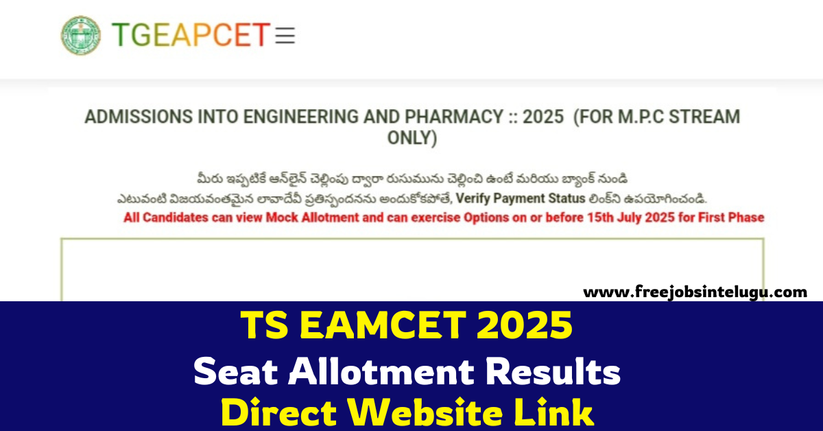 TS EAMCET 2025 Seat Allotment: తెలంగాణ స్టేట్ కౌన్సిల్ ఆఫ్ హయ్యర్ ఎడ్యుకేషన్ (TSCHE) అధికారులు తెలంగాణ ఎంసెట్ 2025 మొదటి విడత సీట్ అలాట్మెంట్ ఫలితాలను జూలై 13, 2025న విడుదల చేయనున్నారు గతంలో విడుదల చేసిన తెలంగాణ ఎంసెట్ కౌన్సిలింగ్ నోటిఫికేషన్ షెడ్యూల్లో స్పష్టంగా సీట్ అలాట్మెంట్ ఫలితాలకు సంబంధించిన తేదీని పేర్కొనడం జరిగింది. మొదటి విడత కౌన్సిలింగ్ లో వెబ్ ఆప్షన్స్ పెట్టుకున్నటువంటి విద్యార్థులు, మీకు ఏ కాలేజీలో సీటు వచ్చిందో … Read more