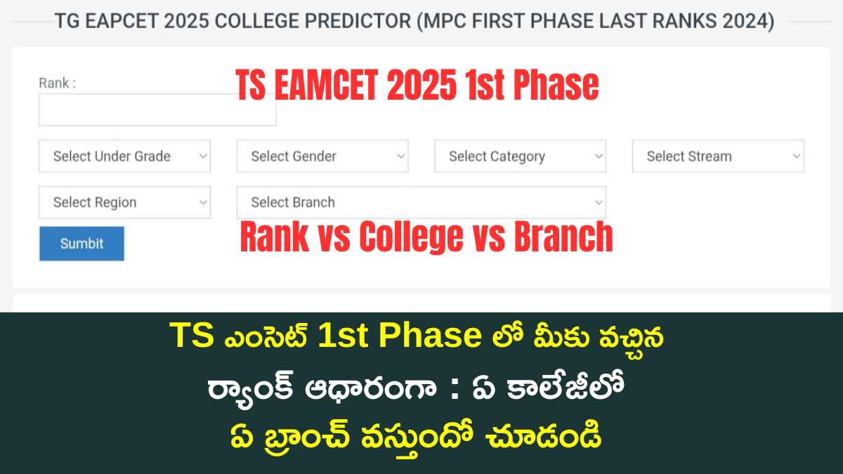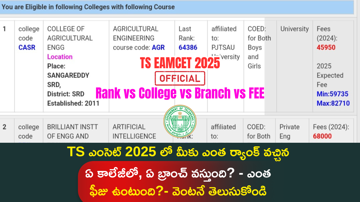 AP EAMCET 2025: ఏపీ ఎంసెట్ 2025 ఫలితాలు జూన్ 8వ తేదీన విడుదల చేసిన విషయం తెలిసిందే. అయితే ఫలితాలలో 10 వేల లోపు ర్యాంకు తెచ్చుకున్నటువంటి వారికి ఏ కాలేజీలలో సీటు వస్తుందో తెలుసుకోవాలనే ఒక ఆత్రుత ఉంటుంది. మీ ర్యాంకు తగిన టాప్ ఇంజనీరింగ్ కాలేజీలు మరియు యూనివర్సిటీలకి సంబంధించినటువంటి పూర్తి జాబితా ఈ క్రింది విధంగా ఉంటుంది. ఇది గత సంవత్సరాల్లో ర్యాంకుల ఆధారంగా స్టూడెంట్స్ పొందినటువంటి కాలేజీల వివరాలను ఆధారంగా … Read more