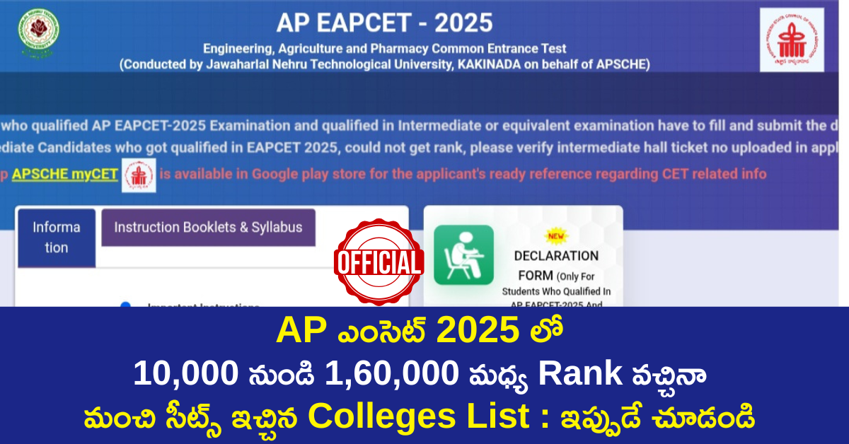 AP EAMCET 2025: 10,000 నుండి 1,60,000 మధ్య ర్యాంకు వచ్చిన వారికి ఏ కాలేజీలలో సీటు వస్తుంది – ఇప్పుడే తెలుసుకోండి.